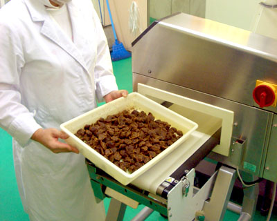 熟練作業員の目で商品を選別し、異物の混入などがないかを確認します。金属探知機による検品