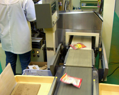 機械により商品の包装を行い、包装完了した商品が出てくる際にも金属探知機による異物の混入が無いかを確認して検品を行います。梱包